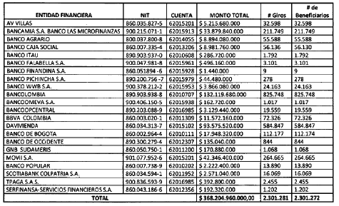 ARTÍCULO 1o. Dar cumplimiento a lo estipulado en el Decreto Legislativo 518 de 2020 y la Resolución número 975 del 6 de abril de 2020 del Ministerio de Hacienda y Crédito Público “por medio de la cual se define el monto de los recursos a transferir, la periodicidad de las transferencias y los mecanismos de dispersión del Programa Ingreso Solidario, y se dictan otras disposiciones”, posteriormente modificada por las Resoluciones número 1022 del 20 de abril, número 1117 del 14 de mayo, número 1165 del 22 de mayo y número 1233 del 10 de junio de 2020, adoptadas por el Departamento Administrativo para la Prosperidad Social mediante la Resolución número 01215 del 6 de julio de 2020, modificada por la Resolución número 01329 de 22 de julio de 2020, y en consecuencia ordenar el pago de los recursos del Programa Ingreso Solidario a favor de las personas en situación de pobreza y vulnerabilidad que han sido relacionadas por el Subdirector General de Programas y Proyectos, radicado con el número M-2021-4000-019363 del 22 de junio de 2021 y número M-2021-4000-019586 del 23 de junio de 2021, agrupados en la cuantía y entidades financieras que se indican a la siguiente tabla, con cargo a los recursos del Fondo de Mitigación de Emergencias (Fome), amparados en el certificado de disponibilidad presupuestal número 19221 del 15 de julio de 2021: