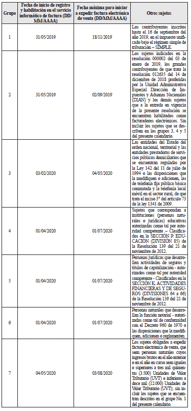 a) Grupo: Corresponde al orden en que los sujetos obligados a expedir factura electrónica de venta, deben cumplir con las fechas indicadas para la fase de registro y habilitación en el servicio informático electrónico de validación previa de factura electrónica y expedición de la misma.