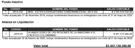 Que conforme a los memorandos números 2020004023-I del 3 de septiembre de 2020 y 2020005307 del 1 de diciembre de 2020, el Vicepresidente de Crédito y Cobranza da cuenta que el Fondo MEN Icetex Licenciaturas Condonables No. 2014-232 que se encuentra inactivo, y la alianza CERES de las Regiones de la Amazonía y el Pacífico colombiano 2010-43 que se encuentra en proceso de liquidación, con saldo disponible no comprometido en convocatorias actuales o futuras, y cuentan con saldo total disponible por valor de TRES MIL OCHOCIENTOS CUARENTA Y SIETE MILLONES CIENTO TREINTA MIL TRESCIENTOS NOVENTA Y NUEVE PESOS CON SEIS CENTAVOS ($3.847.130.399,06) M/CTE, con los documentos de utilización de recursos disponibles debidamente diligenciados conforme a lo previsto en los Decretos Legislativos 467 y 662 de 2020, y con el siguiente detalle: