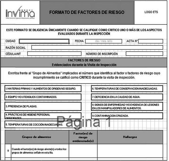 Todas las actas de inspección sanitaria con enfoque de riesgo se diseñaron con la misma estructura a saber: Identificación del establecimiento, Concepto sanitario de la última visita sanitaria, motivo de la visita, evaluación, condiciones sanitarias de instalaciones y proceso, concepto sanitario, relación de muestras tomadas en el establecimiento, requerimientos sanitarios, aplicación de medida sanitaria de seguridad, observaciones y notificación del acta.