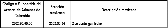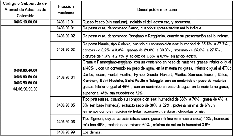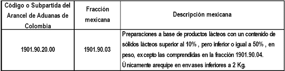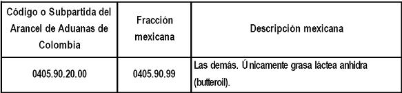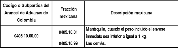 | Código o Subpartida del Arancel de Aduanas de Colombia | Fracción mexicana | Descripción mexicana |