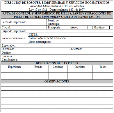 Acta de control y seguimiento de pieles o partes de pieles objeto de exportación: Es el documento suscrito por la autoridad administrativa CITES de Colombia, al momento de realizar el control y seguimiento a las pieles y partes o fracciones de pieles de la especie Caiman crocodilus, que son objeto de exportación.