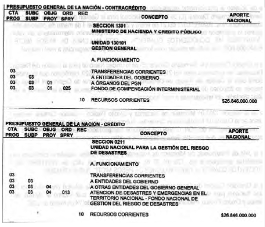 Que de acuerdo al procedimiento establecido en el artículo 4o de la Ley 718 de 2001, el Director General y el Secretario General (E) de la Unidad Nacional para la Gestión del Riesgo de Desastres, mediante oficios números 2020EE00371 del 21 de enero y 2020EE1923 del 4 de marzo del presente año solicitaron la asignación de recursos con cargo al Fondo de Compensación Interministerial por valor de veintiséis mil ochocientos cuarenta y seis millones de pesos ($26.846.000.000) moneda corriente, con el fin de atender a las familias afectadas por emergencias a nivel nacional.