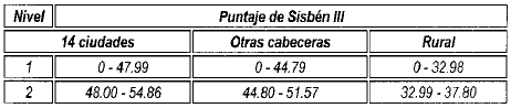 “Artículo 1o. Puntos de corte del Sisbén Metodología III. Establecer como puntos de corte para la afiliación al Régimen Subsidiado de Salud, conforme a la desagregación contenida en el documento CONPES 117 de 2008, los siguientes: