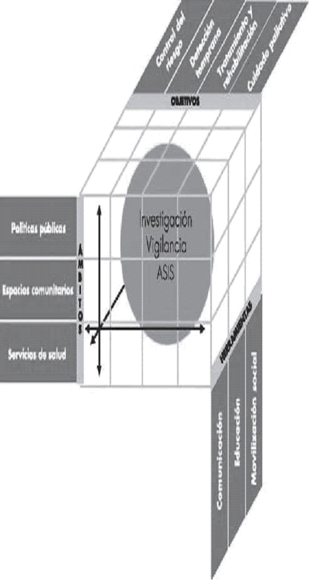 El modelo orienta conceptualmente el abordaje tanto del cáncer como de otras enfermedades crónicas no transmisibles y constituye uno de los fundamentos teóricos para la formulación del presente Plan Decenal para el Control del Cáncer. A partir del modelo se han elaborado, concertado y publicado otros tres documentos técnicos, como son, los lineamientos sobre Movilización social para el control del cáncer (3), Guía para la comunicación educativa en el marco del control del cáncer (4) y Guía de análisis de situación de cáncer (5). Adicionalmente, en desarrollo del mismo se establecieron las prioridades para la investigación en cáncer a nivel nacional mediante un proceso con amplia participación (6)