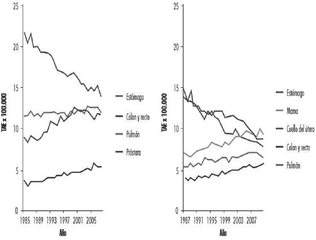 En 2010, se registraron 33.450 defunciones por cáncer, que representaron 16.9% del total de defunciones, de estas 16.381 fueron en hombres y 17.069 en mujeres, con una tasa cruda de mortalidad por cáncer de 72,9 por 100.000 y 74.1 por 100.000, respectivamente. En adultos, las principales causas de muerte por cáncer en hombres son estómago, pulmón, próstata, colon y recto, mientras que en mujeres son, mama, cuello uterino, estómago y pulmón. En niños, las principales localizaciones de cáncer son las leucemias, los tumores de sistema nervioso central y los linfomas. El comportamiento de la mortalidad para los principales cánceres ha sido en general al incremento tanto en hombres como en mujeres, con excepción del cáncer de estómago (17,18). En la última información disponible sobre las tendencias de la mortalidad, se observa una tendencia al incremento de la mortalidad por cáncer de mama y pulmón en mujeres y próstata, colon y recto en ambos sexos. Una buena noticia es la tendencia significativa a la disminución en la mortalidad por cáncer de cuello uterino (15). (Gráfico 1).