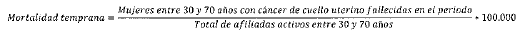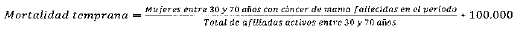 Mide la tasa de mujeres entre 30 y 70 años con diagnóstico de cáncer de mama, que fallecen en el periodo a causa de la patología.