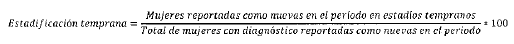 - Numerador: Número de mujeres con cáncer de mama reportadas como nuevas en el periodo en estadios tempranos de la enfermedad.