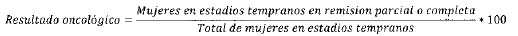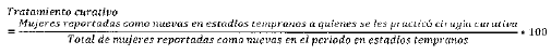 - Denominador: Total de mujeres reportadas como nuevas en el periodo con cáncer de cuello uterino en estadios tempranos (excluye el Ca in situ).
