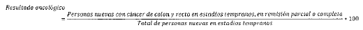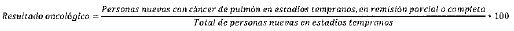 - Numerador: Número de personas reportadas como nuevas en el periodo con cáncer de tráquea, bronquios y pulmón en estadios tempranos, cuyo manejo termina en remisión parcial o completa.