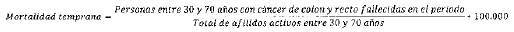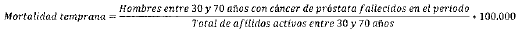 - Numerador: Número de personas entre 30 y 70 años con cáncer de tráquea, bronquios y pulmón, reportadas en estadísticas vitales como fallecidas a causa del cáncer durante el periodo.
