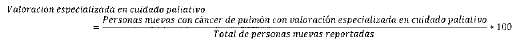 - Numerador: Número de personas reportadas como nuevas con cáncer de tráquea, bronquios y pulmón, que fueron valoradas por medicina especializada en cuidado paliativo durante el periodo.