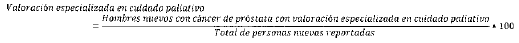 - Numerador: Número de hombres reportados como nuevos con cáncer de próstata, que fueron valorados por medicina especializada en cuidado paliativo durante el periodo.
