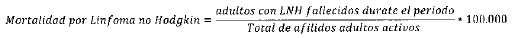 - Numerador: Número de adultos con Linfoma no Hodgkin, reportadas en estadísticas vitales como fallecidas en el periodo a causa del cáncer.