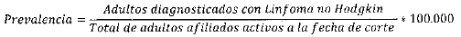 - Numerador: Número de adultos diagnosticados con Linfoma no Hodgkin afiliados activos a la fecha de corte de la información.