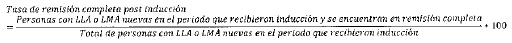 - Numerador: Número de personas con LLA o LMA reportadas como nuevas en el periodo, que recibieron inducción y se encuentran en remisión completa.