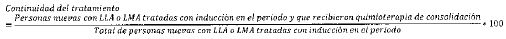 - Numerador: Número de personas reportadas como nuevas con LLA o LMA en el periodo, tratadas con inducción y que recibieron quimioterapia de consolidación.