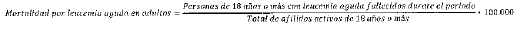 - Numerador: Número de personas de 18 años o más diagnosticadas con leucemia aguda, reportadas en estadísticas vitales como fallecidas en el periodo a causa del cáncer.
