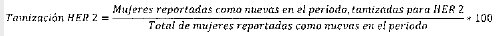 - Numerador: Número de mujeres con cáncer de mama reportadas como nuevas en el periodo a quienes se les realizó la prueba de tamización HER 2 de manera previa al inicio del tratamiento. Excluye casos de Ca in situ.