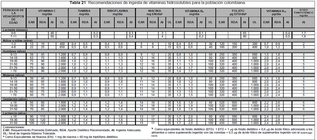Se establecen las recomendaciones de ingesta para ocho vitaminas hidrosolubles, para todos los grupos de edad y estado fisiológico, expresadas de la siguiente forma: a) Vitamina B6, Folato, Niacina y Vitamina C, expresadas en los valores de referencia AI EAR, RDA y UL; b) Vitamina B12, Tiamina y Riboflavina, expresadas con los valores de referencia AI, EAR y RDA; c) el Ácido Pantoténico expresado en el valor de referencia AI.