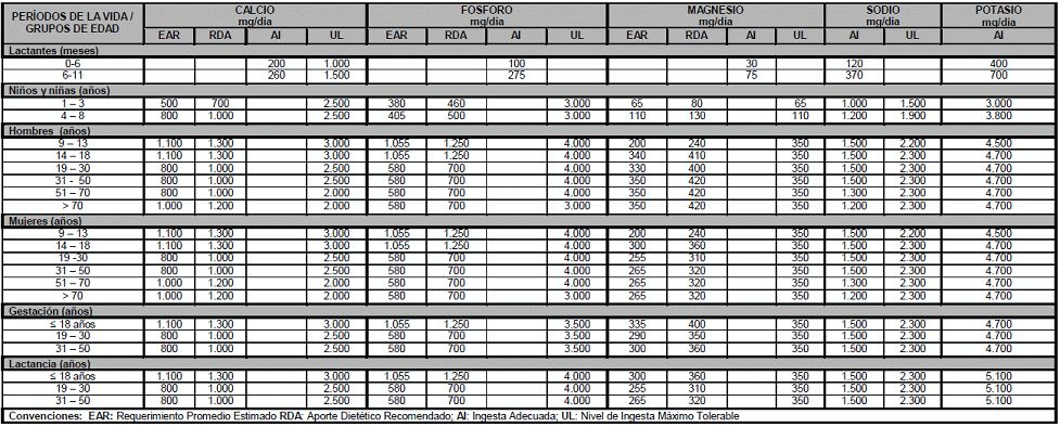 3.9. Recomendaciones de Ingesta de Macro Minerales: Se establecen las recomendaciones de ingesta para 5 macro minerales, para todos los grupos de edad y estado fisiológico, expresadas de la siguiente forma: a) calcio, fósforo y magnesio expresados como EAR, RDA, AI y UL; b) sodio expresadas con los valores de referencia AI, UL; c) potasio expresado como AI.