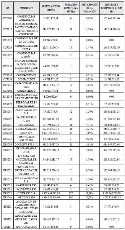 Que de acuerdo con el citado mecanismo, las EPS y las EOC deben aportar recursos para contribuir a la conformación de un fondo común, de acuerdo con la proporción de afiliados activos que tiene cada una a la fecha de corte en cada vigencia, para después con cargo a dicho fondo, determinar los montos a reconocer y pagarles, de haber lugar a ello, calculados a partir de la cantidad de pacientes con “Hemofilia A Severa”, reportados por cada aseguradora.