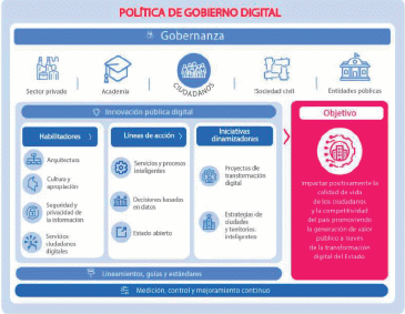 De acuerdo con el artículo 2.2.9.1.2.1. del Decreto 1078 de 2015 (DUR-TIC), la Política de Gobierno Digital se desarrollará a través de un esquema que articula los elementos que la componen, a saber: gobernanza, innovación pública digital, habilitadores, líneas de acción, e iniciativas dinamizadoras, con el fin de lograr su objetivo.