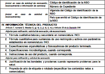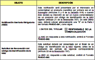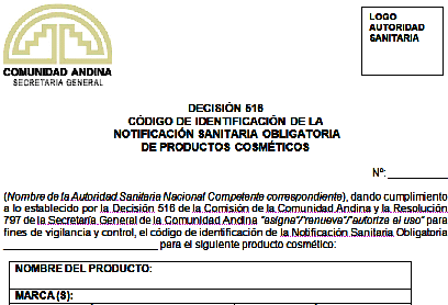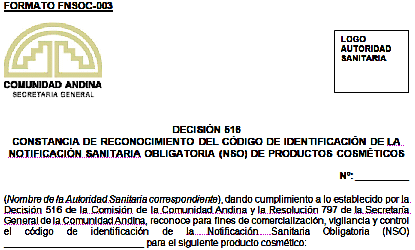 Que la Decisión 516 señala que los productos cosméticos requieren de la Notificación Sanitaria Obligatoria (NSO) para su comercialización o expendio en la Subregión y establece los requisitos que deberán acompañar a la Notificación Sanitaria Obligatoria y la solicitud de reconocimiento del código de identificación asignado por la Autoridad Nacional Competente para facilitar el etiquetado, la vigilancia y el control sanitario;