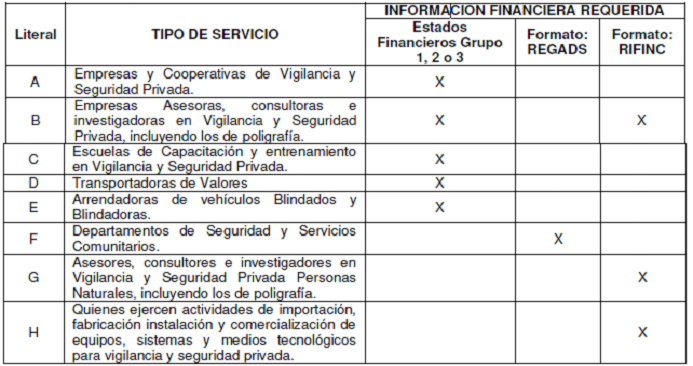 | Empresas y Cooperativas de Vigilancia y Seguridad Privada | Estados financieros aplicando lo definido en la Ley 1314 de 2009 y sus decretos reglamentarios, de conformidad al Grupo al que pertenecen con corte a 31 de diciembre del año inmediatamente anterior. |