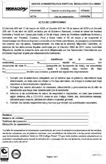 6.3. Cada persona a quien se autorice el ingreso, debe diligenciar el formulario de declaración de estado de salud que se encuentra en la página web de Migración Colombia.